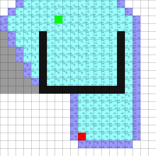 De volgende afbeeldingen tonen de laatste stap en de oplossing van het A* algoritme. Witte cellen hebben een kost van 1 en de grijze cellen een kost 2. De kosten zijn echter vermenigvuldigd met 10 om het rekenen met kommagetallen te vermijden/beperken (hetgeen relatief veel tijd in beslag kan nemen).